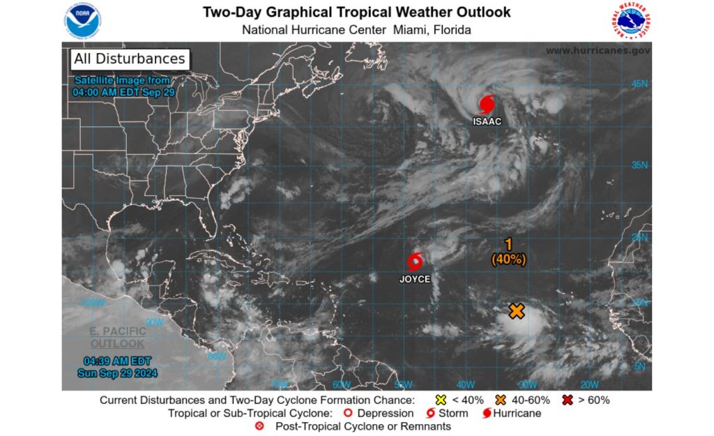 El Centro Nacional de Huracanes ha emitido advertencias sobre el Huracán Isaac, localizado a cientos de millas al oeste-noroeste de las Azores, y en la Tormenta Tropical Joyce, ubicada sobre el Océano Atlántico central.