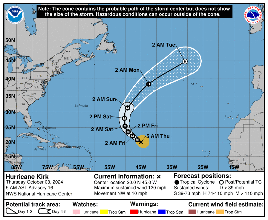 Pronóstico de la trayectoria del gran huracán Kirk y su interacción con un sistema de baja presión superficial en el Atlántico Norte modulará el patrón climático local, que promueve un flujo de viento del norte y La humedad se acumula en partes de Puerto Rico y las Islas Vírgenes de los Estados Unidos Islas el viernes y sábado.