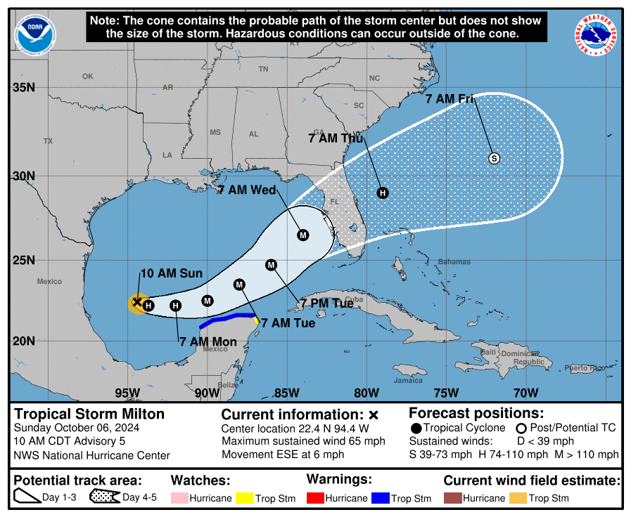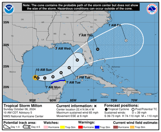 Milton se ha fortalecido en las últimas horas, con vientos de 65 mph, y es probable que entre hoy y mañana se convierta en huracán categoría 1. El sistema se mueve lentamente a 5 mph, lo que podría facilitar su fortalecimiento gradual. Se espera que alcance la categoría 3 (125 mph) e incluso no se descarta que llegue a categoría 4. Sin embargo, recuerden que la trayectoria y la intensidad pueden variar, por lo que aún es incierto por dónde entrará el ojo del huracán.
