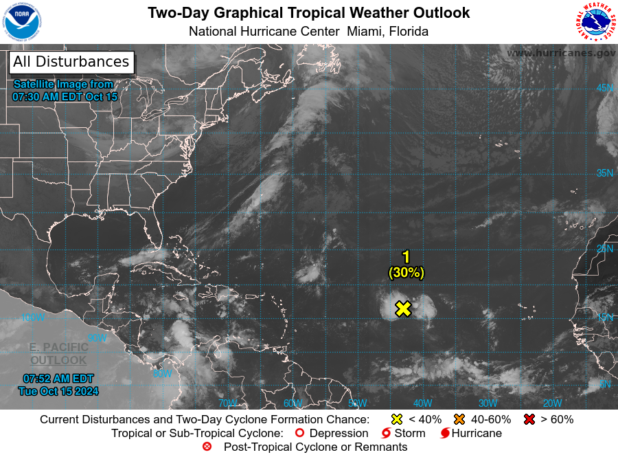 El Centro Nacional de Huracanes (NHC) se mantiene monitoreando el Invest 94L, ya que tiene un área bien definida de baja presión ubicada sobre el centro y está produciendo lluvias ocasionales y tormentas eléctricas.
