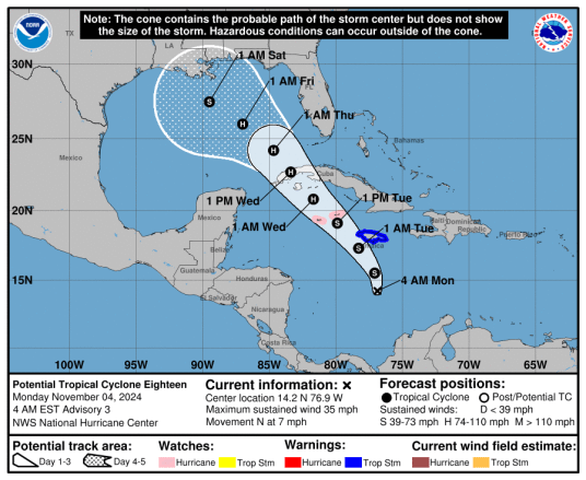 El Potencial Ciclón Tropical #18 tiene vientos sostenidos de 35 mph, pero aún no cuenta con una circulación cerrada, razón por la cual no ha sido clasificado oficialmente como tormenta tropical. Sin embargo, se espera que para esta tarde alcance suficiente organización para ser nombrado como la Tormenta Tropical Rafael.