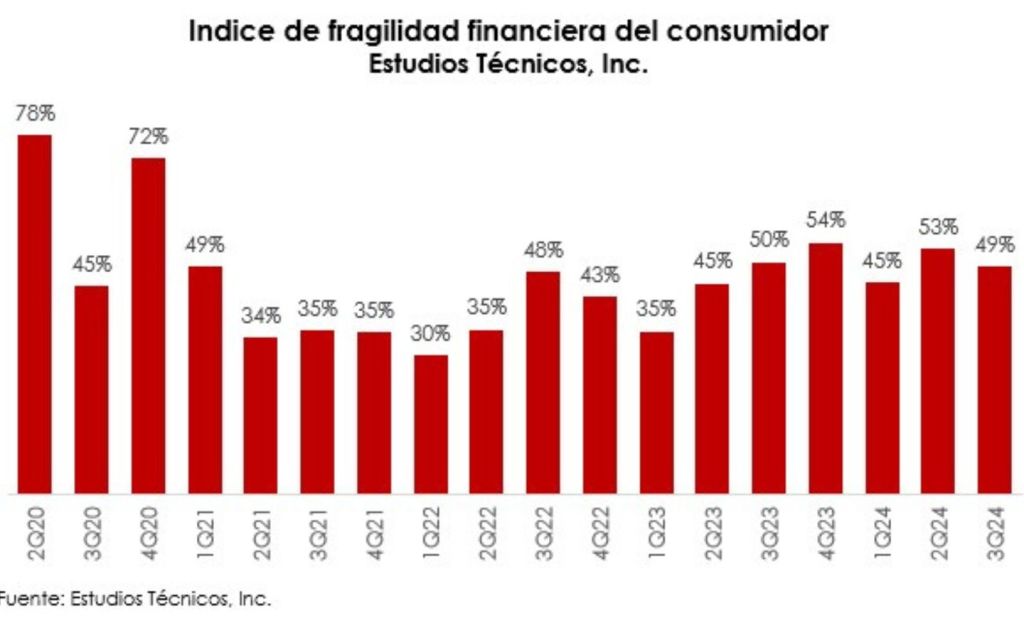El Índice de Fragilidad Financiera del Consumidor (IFFC), elaborado por Estudios Técnicos, Inc. (ETI), refleja un deterioro en la posición financiera de los consumidores a partir del primer trimestre del 2023, con el índice moviéndose de un valor de 35% a un 49% en el tercer trimestre del 2024.