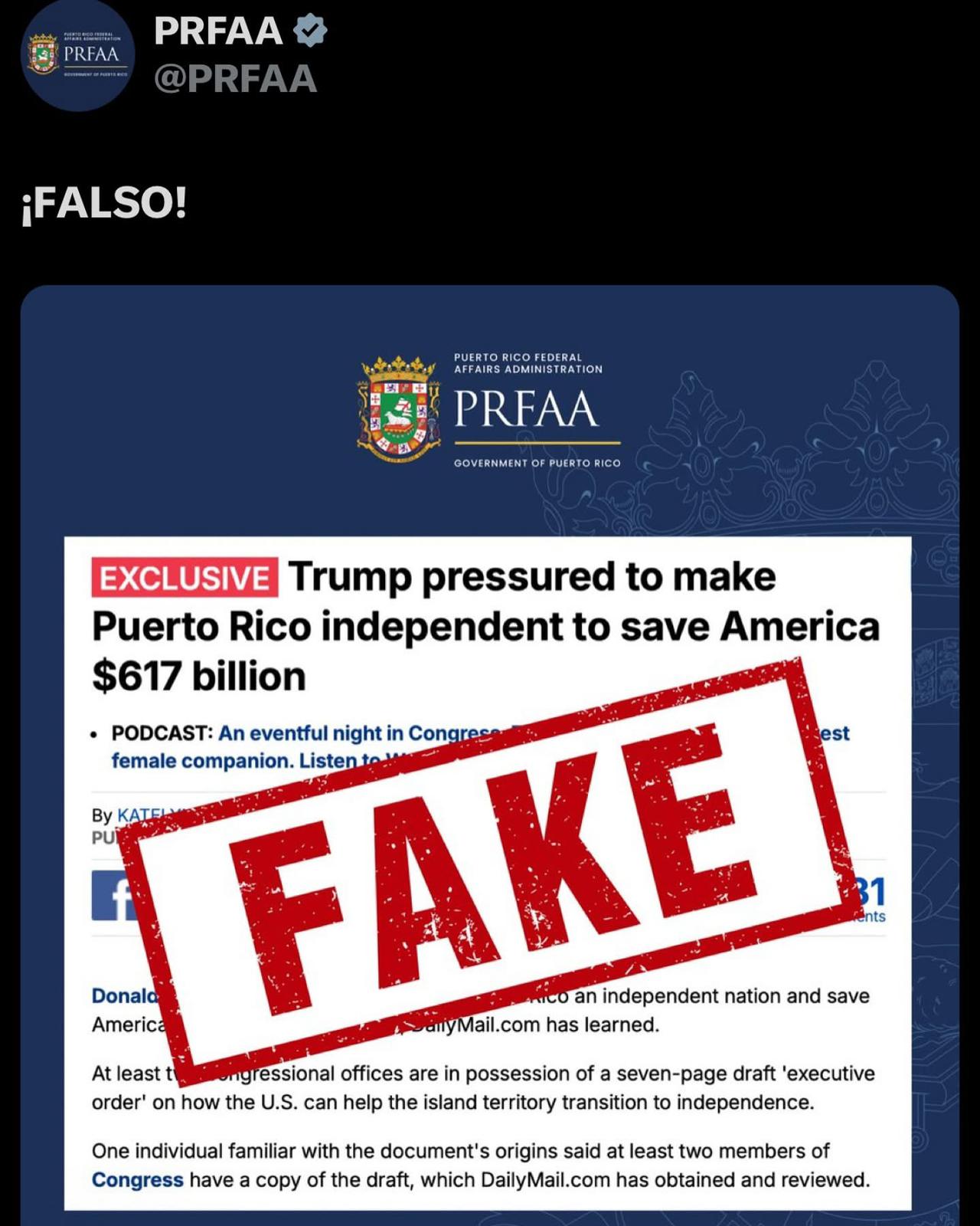 La Administración de Asuntos Federales de Puerto Rico (PRFAA) ha desmentido una noticia falsa que circula en las redes sociales. La información errónea sugiere que el presidente Donald Trump fue presionado para declarar la independencia de Puerto Rico con el fin de ahorrar $617 mil millones a Estados Unidos. La PRFAA ha tomado medidas para aclarar la situación y evitar la propagación de desinformación.