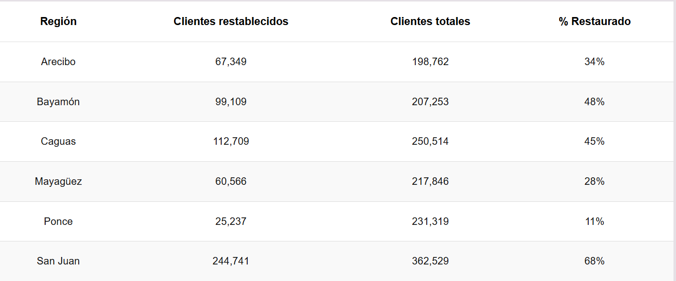 La empresa de LUMA Energy informó que a las 6:00 am, de -hoy jueves- que 609,000 clientes ya cuentan con servicio, lo que representa un 41% del total de clientes.