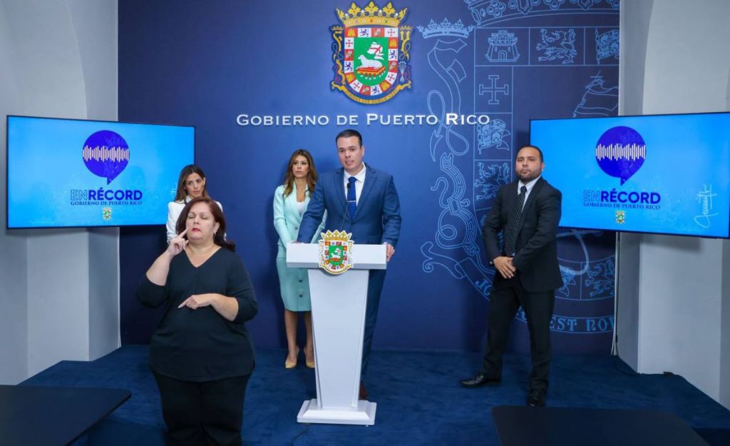 El secretario de Asuntos Públicos, Hiram Torres Montalvo junto a la secretaria del Departamento de Asuntos del Consumidor (DACO), Valerie Rodríguez, el director de la Oficina de Gerencia de Presupuesto, Orlando Rivera, la administradora de la Administración para el Sustento de Menores (ASUME), la licenciada María del Mar Mateu Meléndez y el secretario del Departamento de Hacienda, Ángel Pantoja brindan una actualización sobre los logros de esta semana para sus agencias.