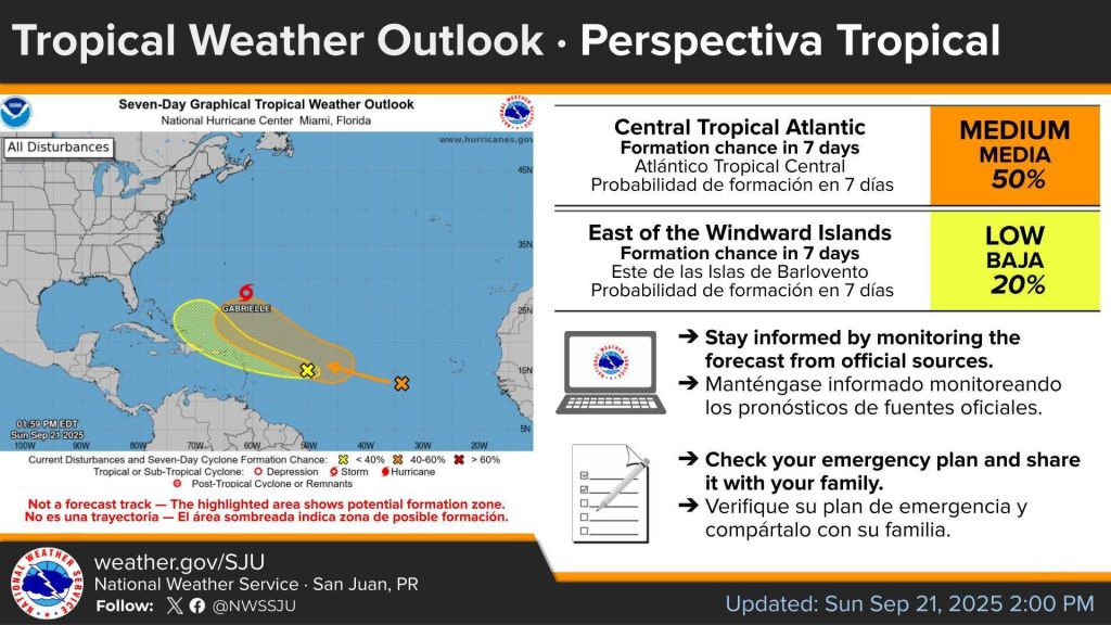 Durante la jornada de hoy, se anticipa la formación de tormentas eléctricas en sectores del interior y norte de Puerto Rico, con potencial de ráfagas de viento, rayos frecuentes y acumulaciones de agua en áreas propensas a inundaciones. En las Islas Vírgenes, se espera un patrón de tiempo variable con lluvias breves y cielos parcialmente nublados.