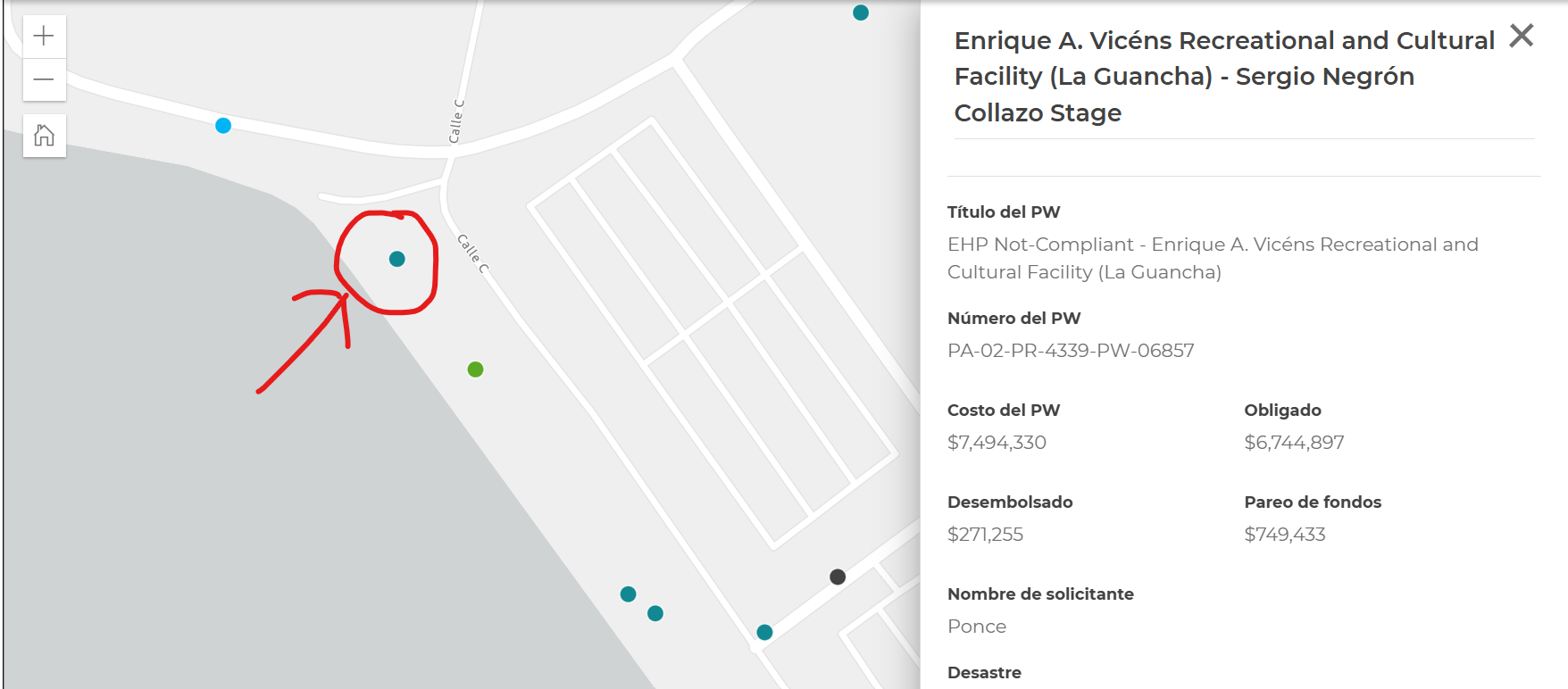 Por otro lado, el costo total estimado del tablado asciende a $3,591,989, de los cuales FEMA ha obligado $3,232,790. Hasta la fecha, se han desembolsado $114,002, y el pareo de fondos alcanza los $359,199.