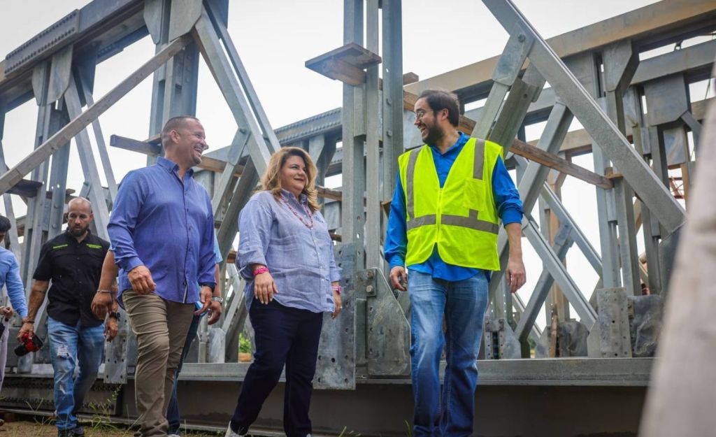 La gobernadora Jenniffer González Colón junto al alcalde Jorge Pérez Heredia inspeccionaron ayer como avanzan los trabajos de la instalación del puente temporero que conecta la PR-123 con la PR-10 cuya obra, indicó el secretario del Departamento de Transportación y Obras Públicas (DTOP), Edwin González, está bastante adelantada.