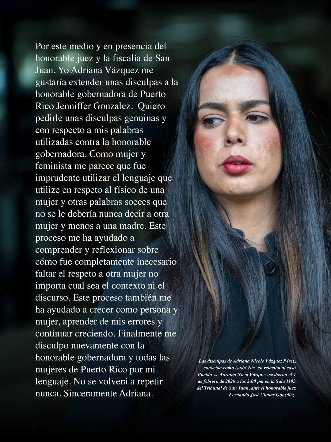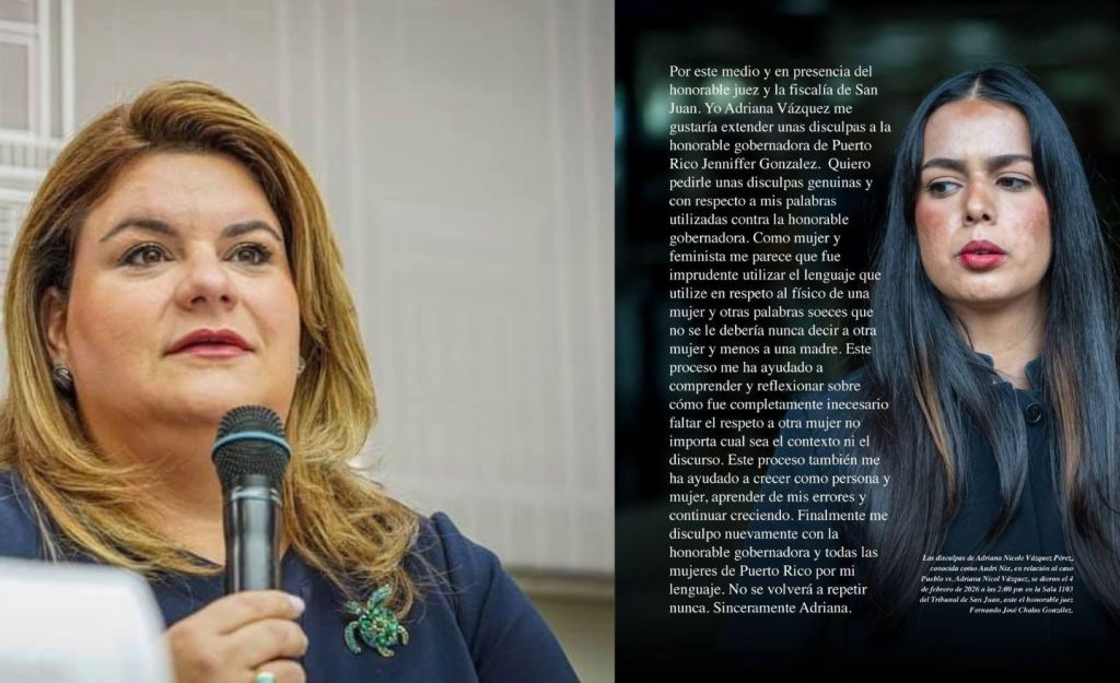 González Colón también anunció que, en representación de su familia, de las mujeres, de los servidores públicos, de la militancia del Partido Nuevo Progresista y del pueblo puertorriqueño, acepta las disculpas ofrecidas en el tribunal por la joven Adriana Nicole Vázquez Pérez «Audri Nix», quien presentó una expresión de arrepentimiento durante la vista celebrada ayer -jueves-, esto luego de que el pasado año esta se presentará en la Cátedra de San Juan en la misa de juramentación donde Vázquez Pérez profirió palabras soeces lo que provocó una alteración a la paz a todos los presentes y esta tuvo que ser sacada del lugar por los agentes.